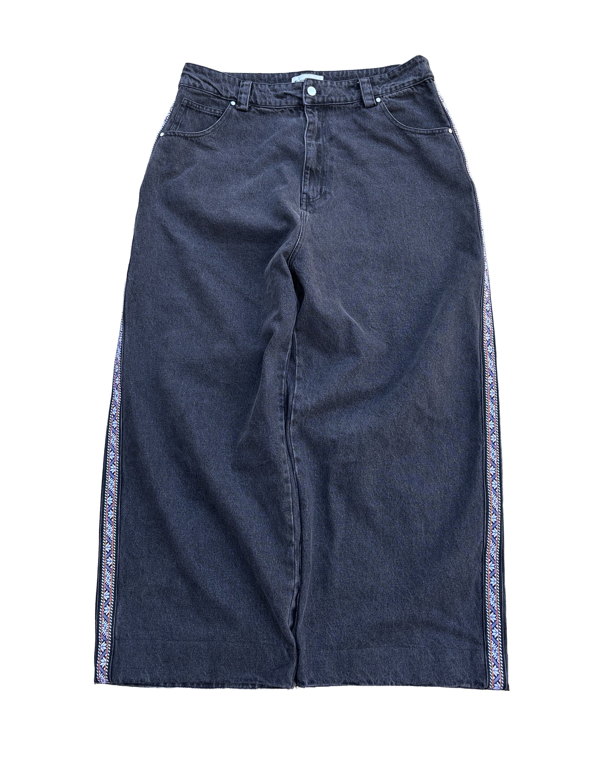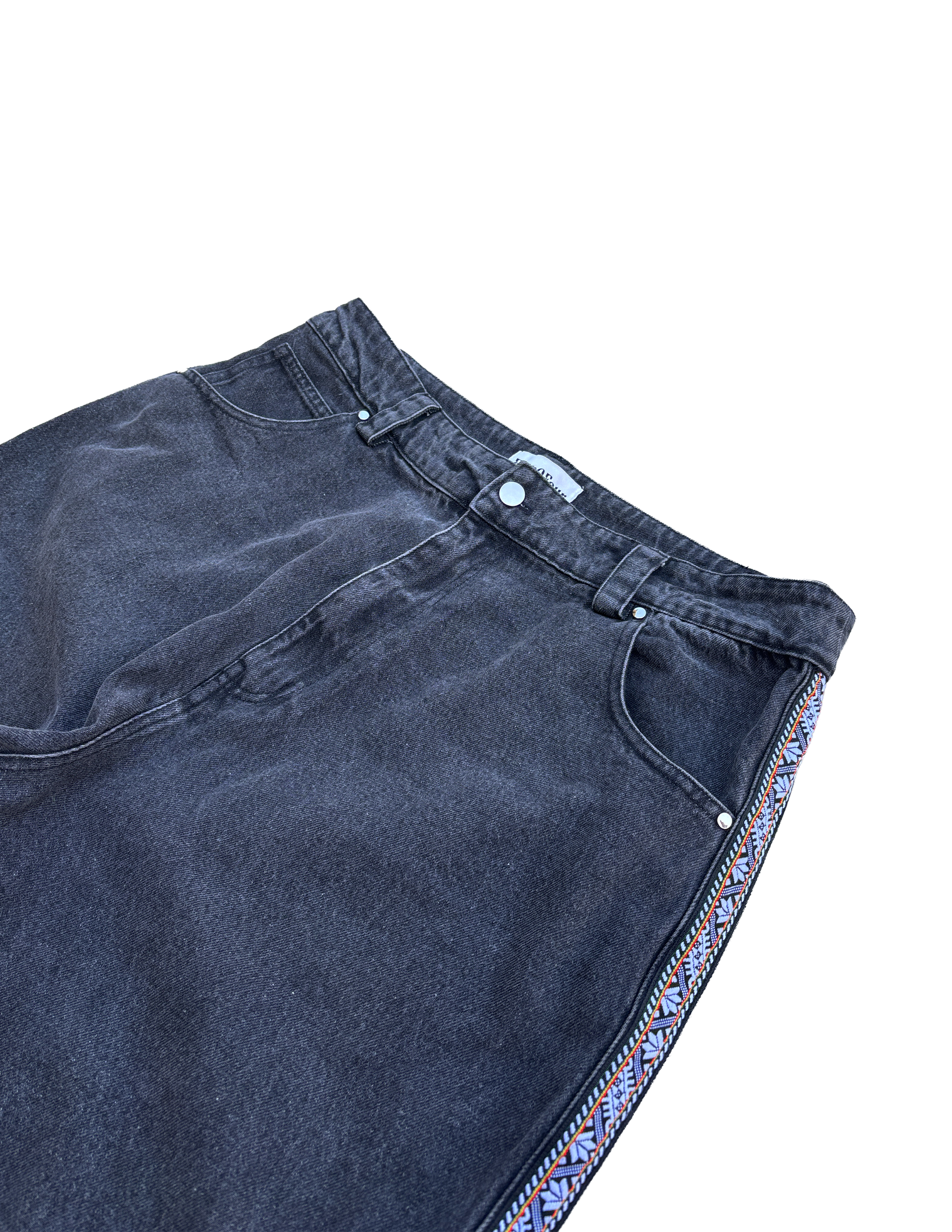 Inspired by our first drop of Aztek pants, these 100% cotton 13oz denim pants contain a unique feature with the yellow side stripe going down each pant leg.